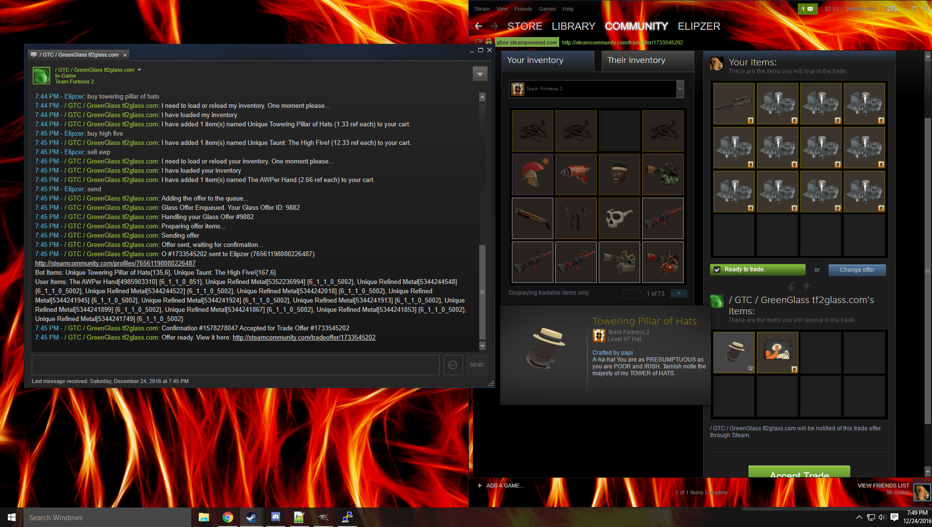 Before I made my website, this chat message system was the primary avenue to trade with the bot. Pictured here is an example of using the bot to buy two items and sell another. The bot automatically added the currency (silver "refined metal") to balance the offer.