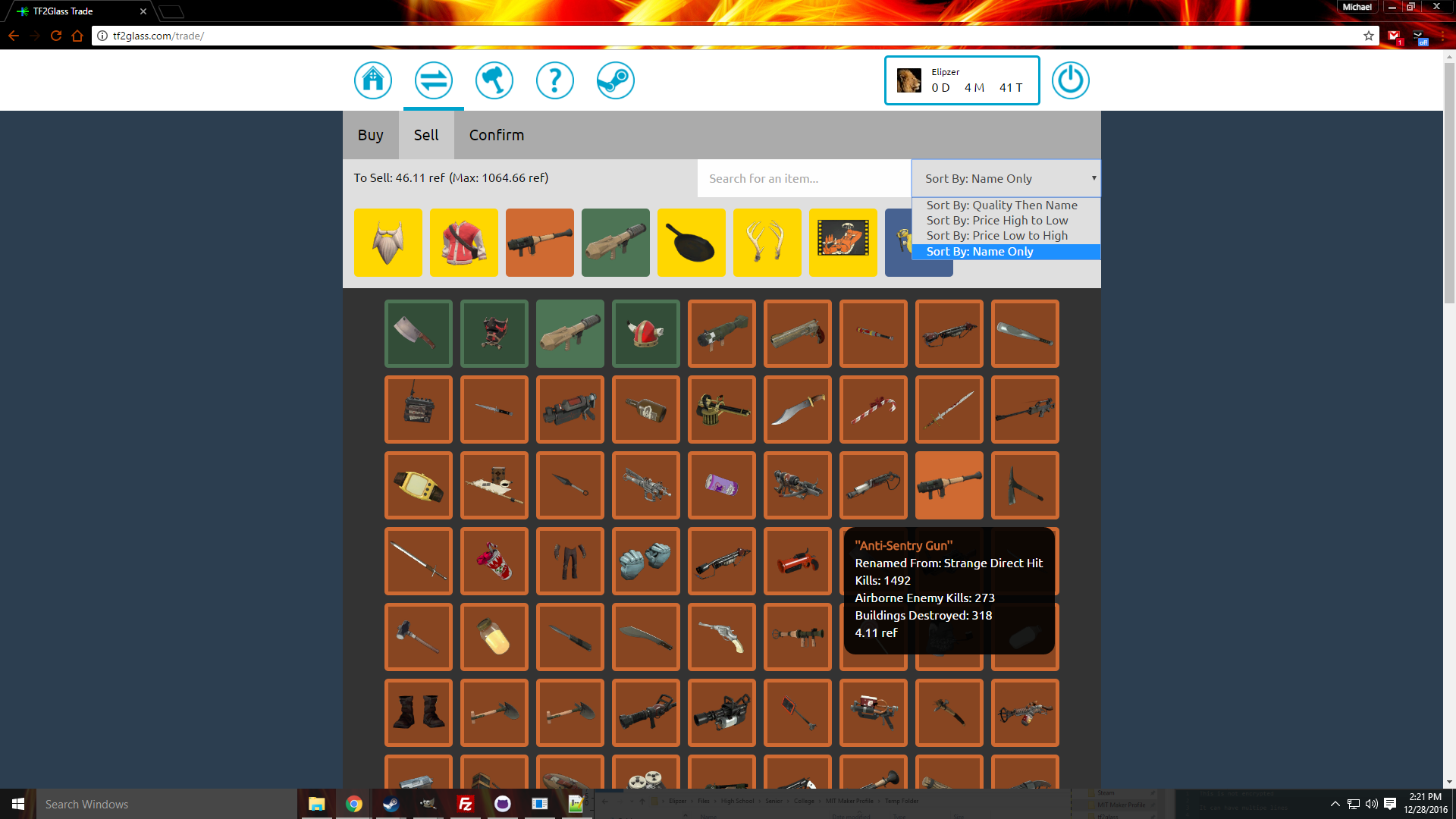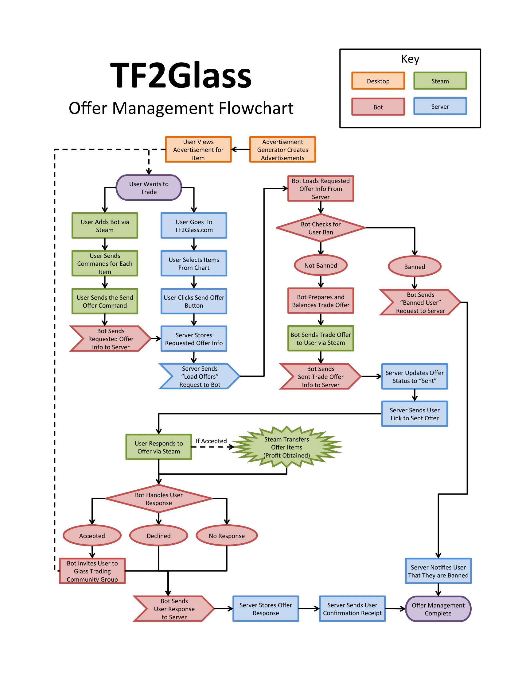 This was the primary value of the site. This page allowed users to interactively select items from their inventories for the bot to purchase. Hovering over items would show the corresponding offer price from the bot. Clicking on an item would add it to the user's cart, either to sell if it was from the user's inventory or to buy if it was from the bot's inventory. Finally, once the user clicked "Send Trade Offer" on the confirm page, the bot would send a Steam trade offer to match the offer the user requested.