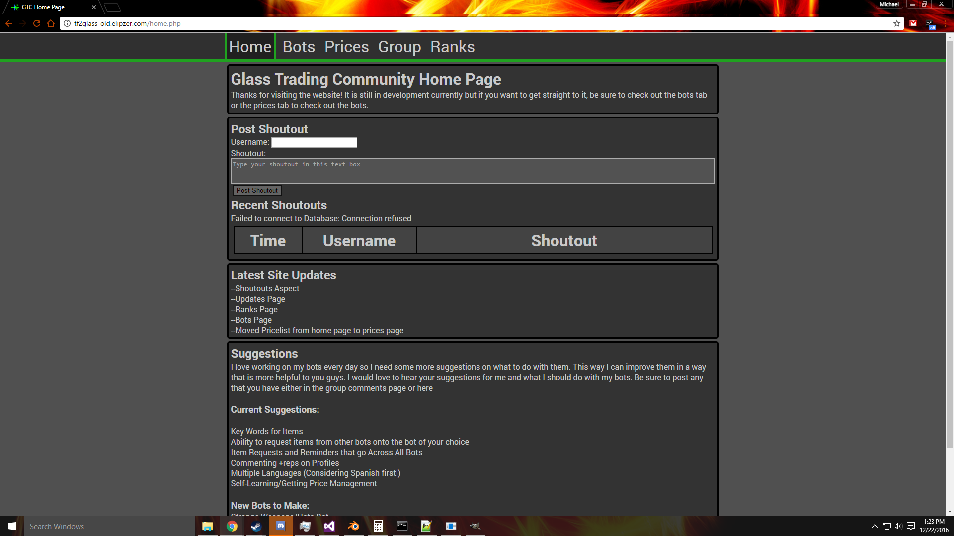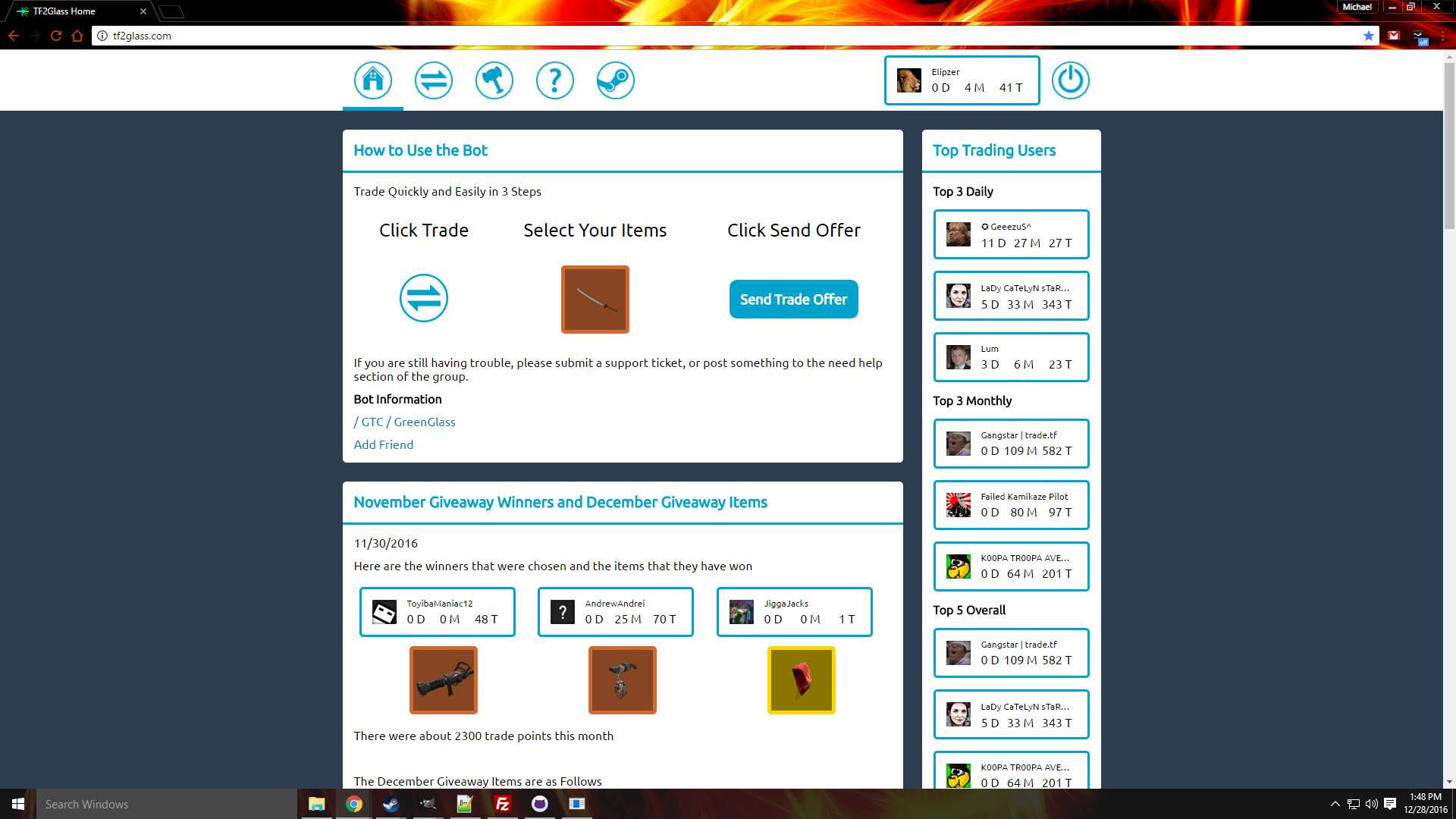 A screenshot of the home page. It included a brief tutorial of how to use the site, announcements including the giveaways that I ran to draw attention to the site, and a top trading users section to display the most frequent users.