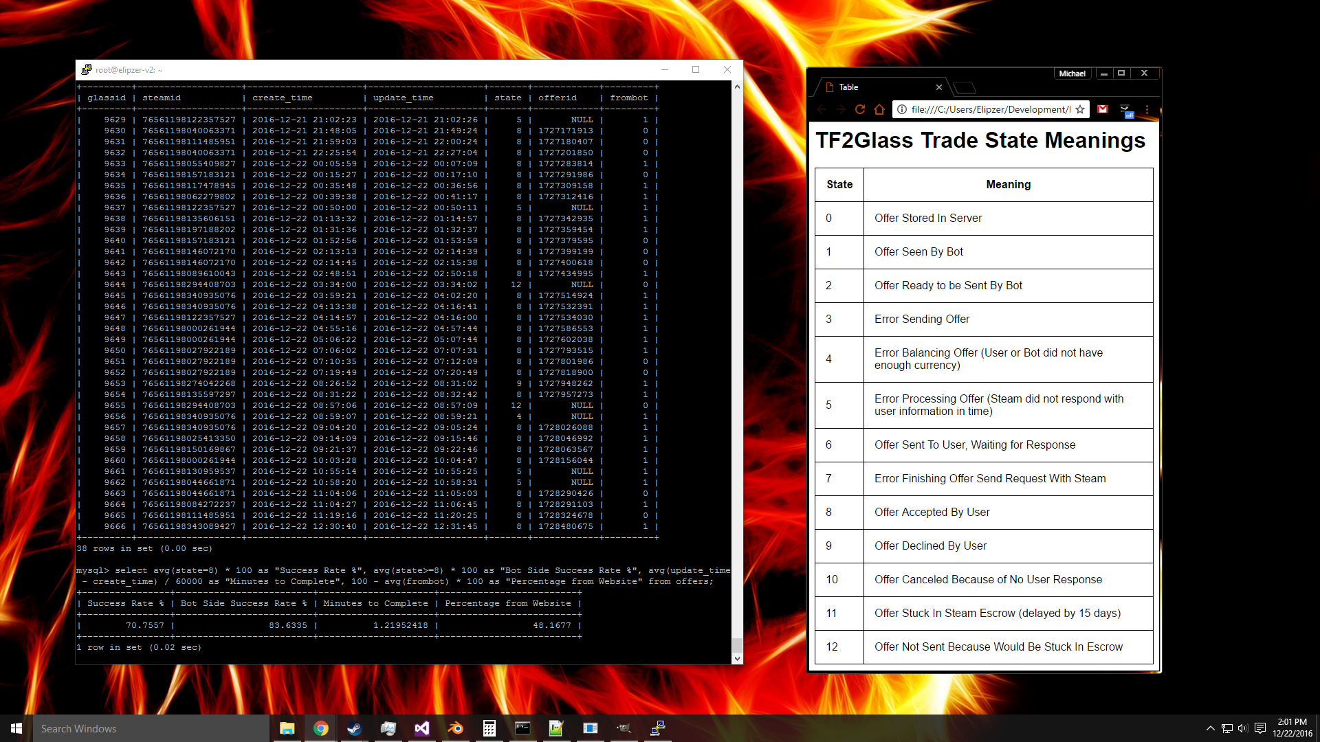 I stored all state in a MySQL database. This screenshot shows a couple of my favorite queries from the database including recent offer states (as enumerated in the right-side table) and summary information. Notably, the "frombot" column shows whether the offer originated from a message to the bot through Steam, rather than the website. Before I created the website, the bot transacted with users with Steam messages instead.